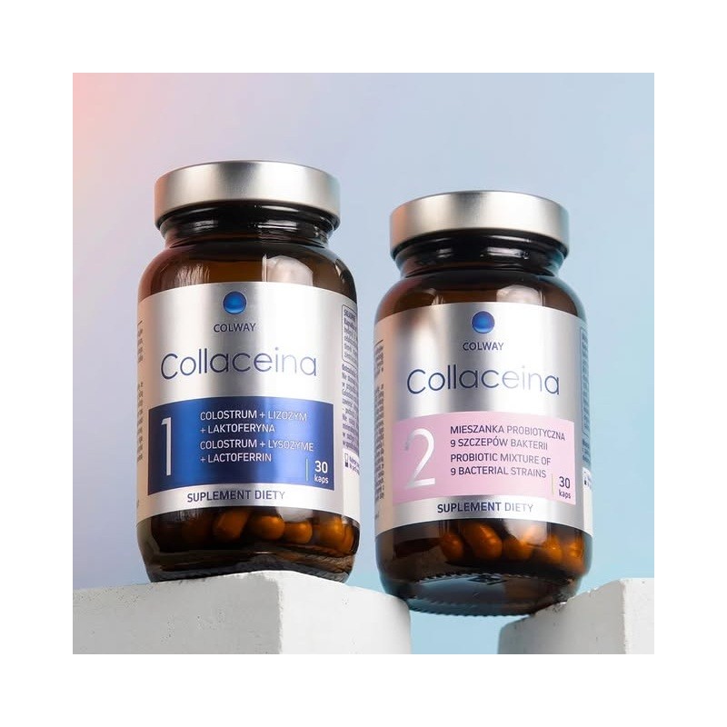 Collaceina ist ein besonderes Supplement, das aus zwei Arten von Kapseln besteht. Die Kapseln des ersten Typs bestehen aus drei Substanzen (Lactoferrin, Lysozym, Kolostrum), von denen jede ein natürlicher und sehr wichtiger Faktor des menschlichen Immunsystems ist. Die zweite Art von Kapseln enthalten lebende Kulturen. Neun ausgewählte Stämme, deren Aufgabe ist, die Erhaltung des Gleichgewichts der bakteriellen Mikroflora in unserem Verdauungssystem, und stellt zugleich eine präbiotische Nahrung für die Bakterien dar: Fructooligosaccharide.